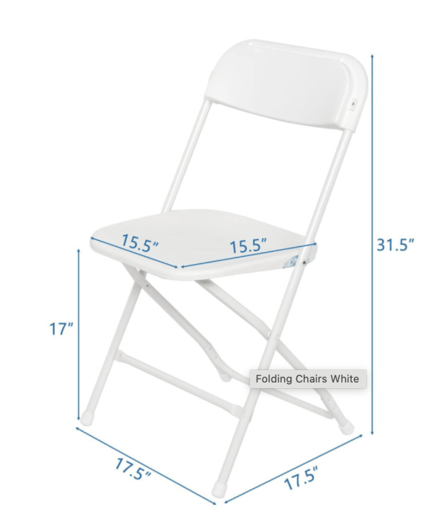 Our white folding chairs are made with sturdy metal frames and contoured plastic seats, designed to support guests of all ages. Easy to set up, stack, and store, they’re ideal for events of any size. Pair them with our tables, tents, and inflatable rentals to complete your party setup effortlessly.