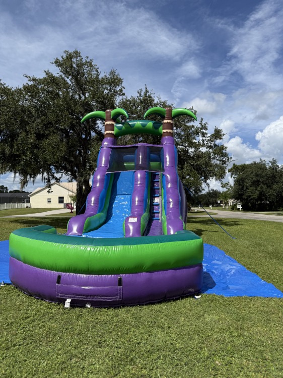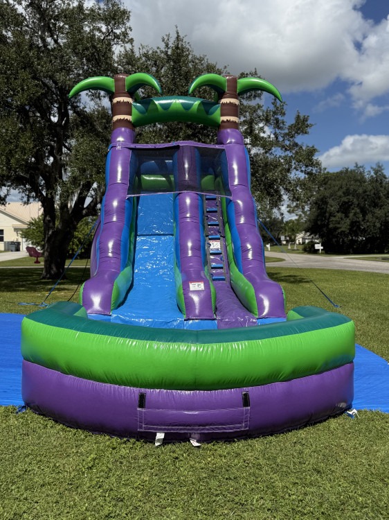 Our Paradise Plunge brings island vibes and nonstop thrills to any party. This 16-foot-tall tropical water slide is perfect for both kids and adults who want to cool off and make a splash in style. With vibrant purple and green palm-tree design, it’s a show-stopper at birthdays, block parties, and family cookouts.