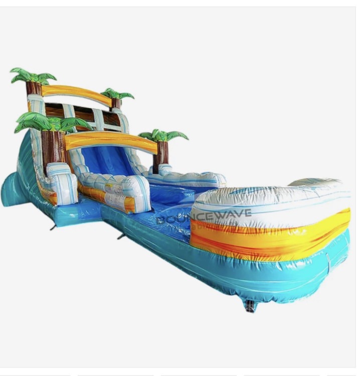 This Dual lane waterslide is tropical paradise for all riders, featuring two 20ft tall palm trees, double racing lanes and a deep splash pool, perfect for all parties!